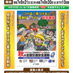 - 2025/07/16 夏の交通事故防止運動 本日より、「夏の交通事故防止県民総ぐるみ運動」がスタートしました。(7月25日までの10日間) ... 続きを読む