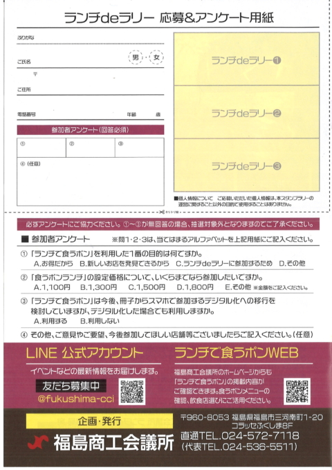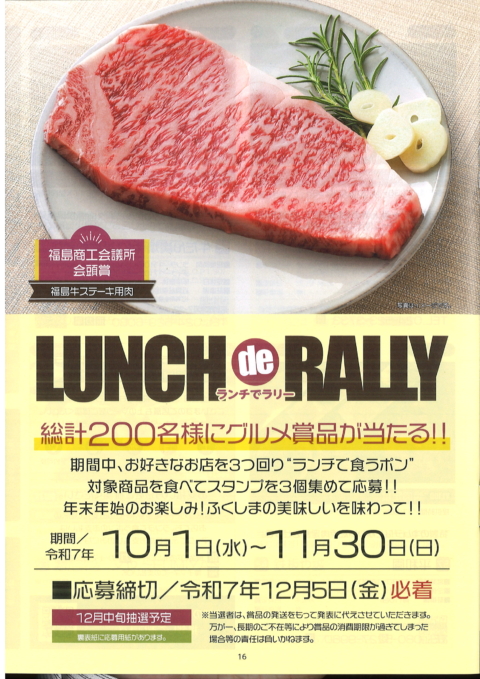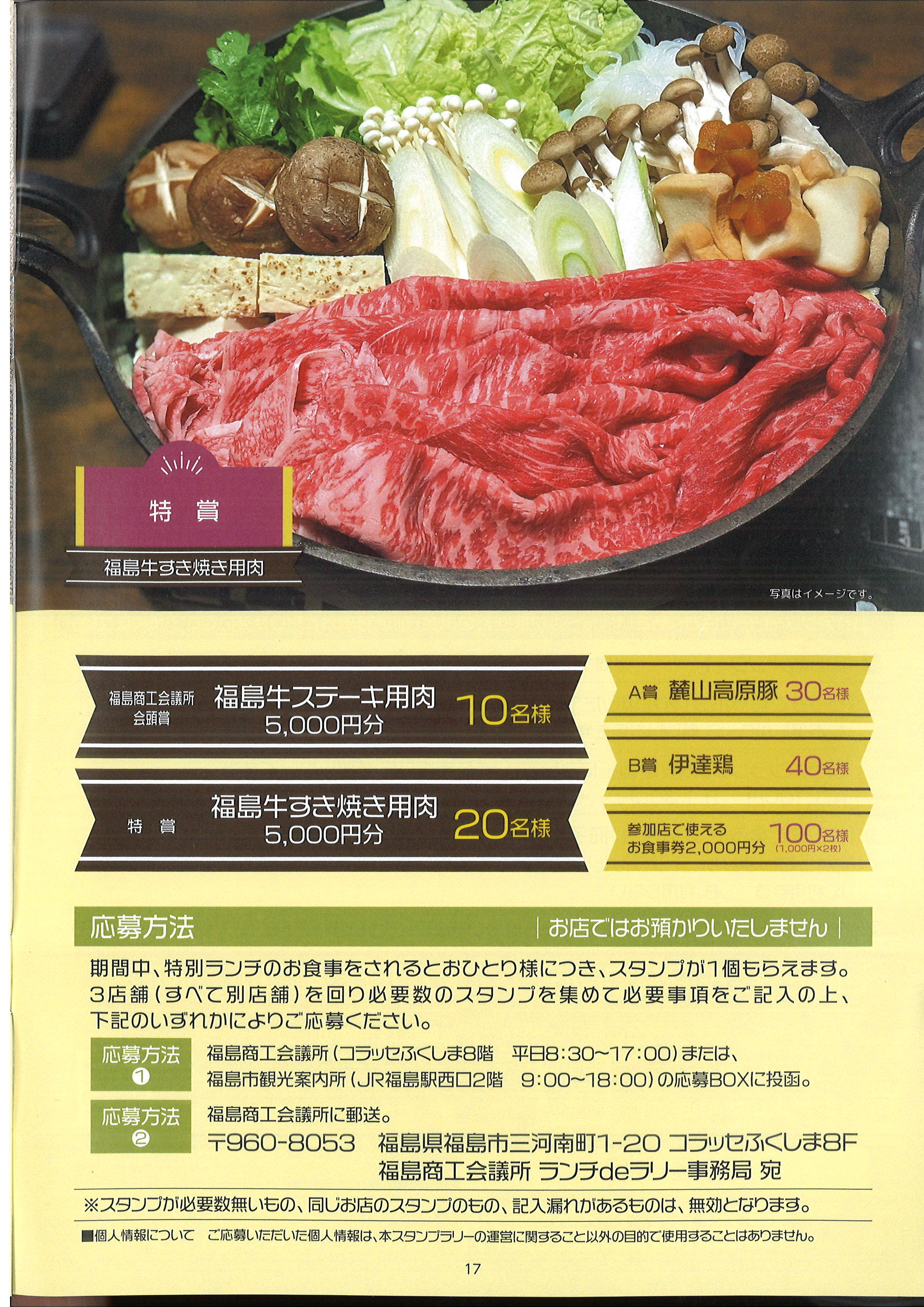 期間中3店舗回って応募すると「福島牛ステーキ用肉」など豪華賞品がGETできる「ランチdeラリー」も開催されております。(応募用紙は冊子にあります)