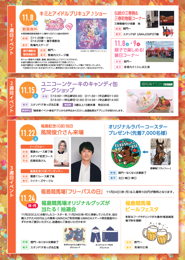 11月8日~11月24日までの毎週土日計6日間(23日(日)は開催せず24日(月)開催)、「秋の福島競馬」が開催されます。